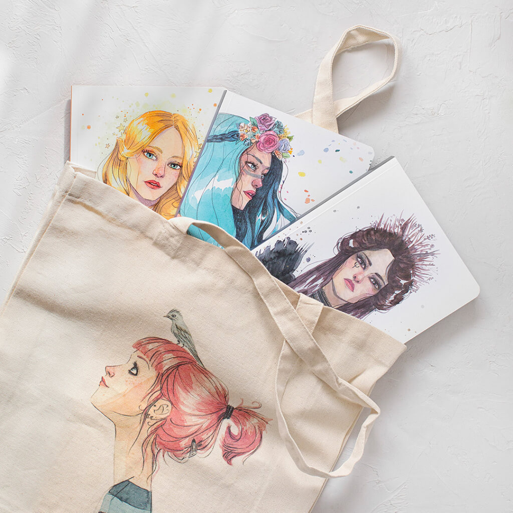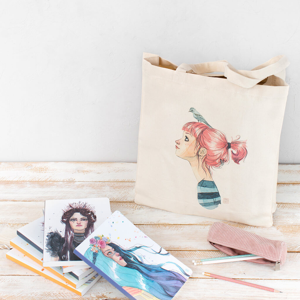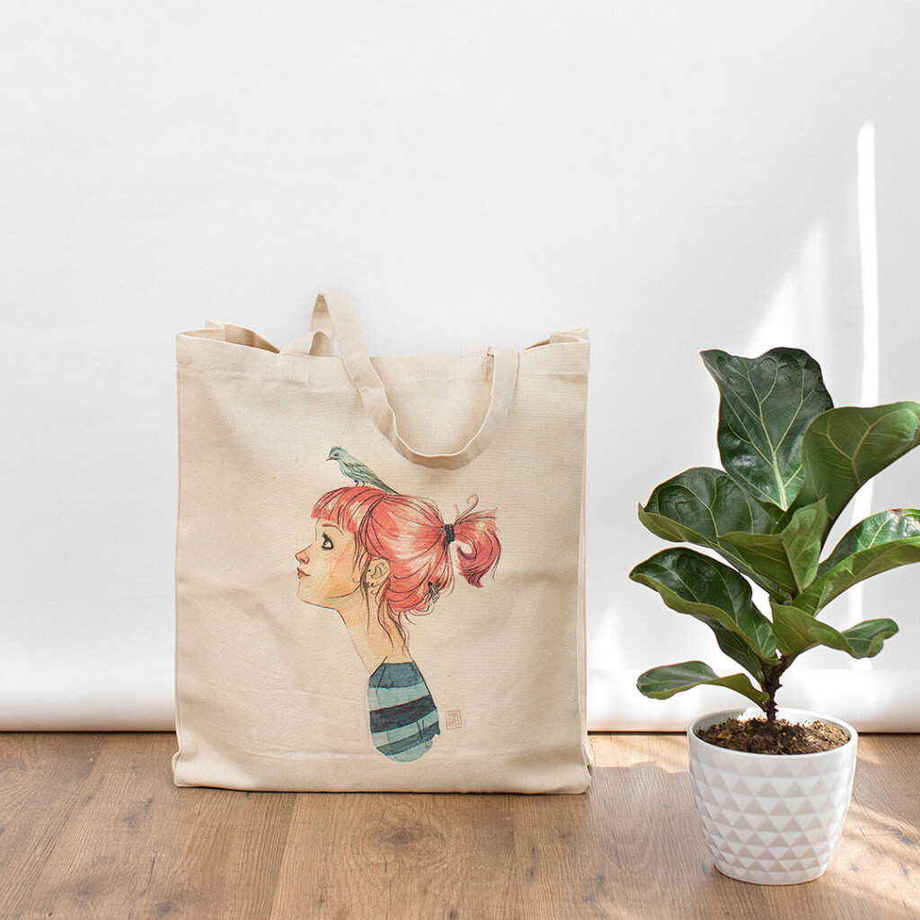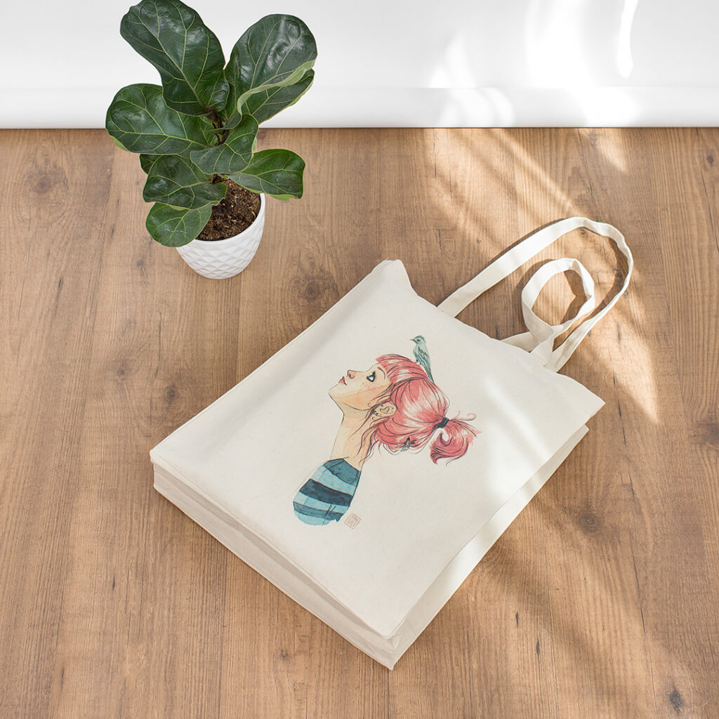 Bolso tipo tote con la mítica ilustración de la ilustradora madrileña Esther Gili "Pájaros en la Cabeza" impresa a todo color.