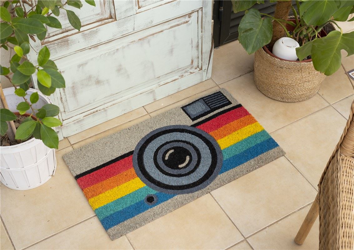 Felpudo de fibra de coco y base de PVC antideslizante con forma de cámara retro.