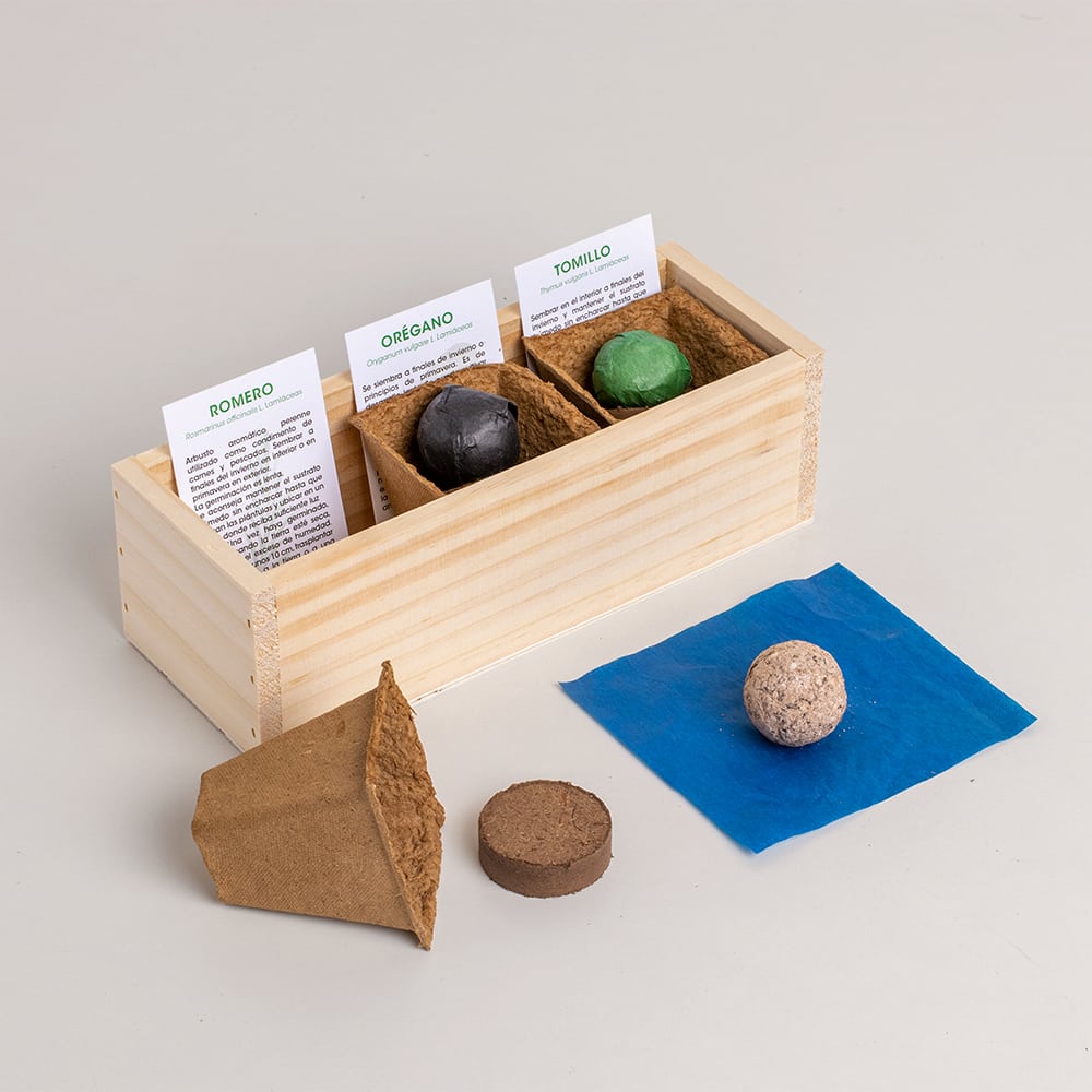 El Kit Mediterráneo contiene todo lo necesario para el cultivo de romero, orégano y tomillo: 3 bombas de semillas, 3 macetas de germinación 100% biodegradables, 3 pastillas de sustrato y 3 fichas de cultivo.