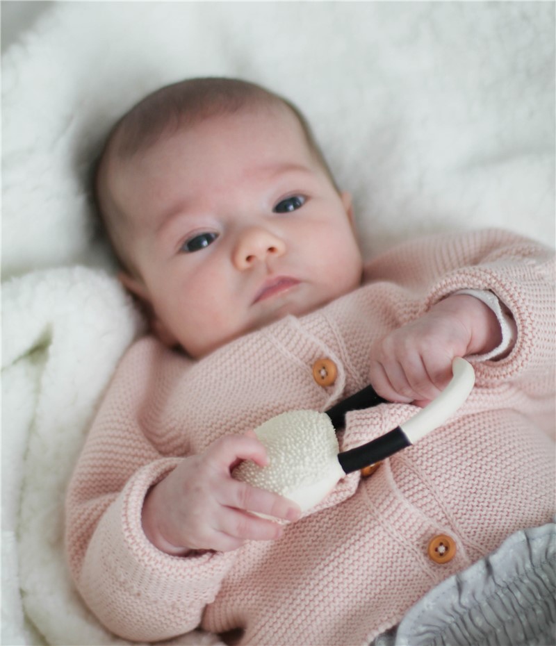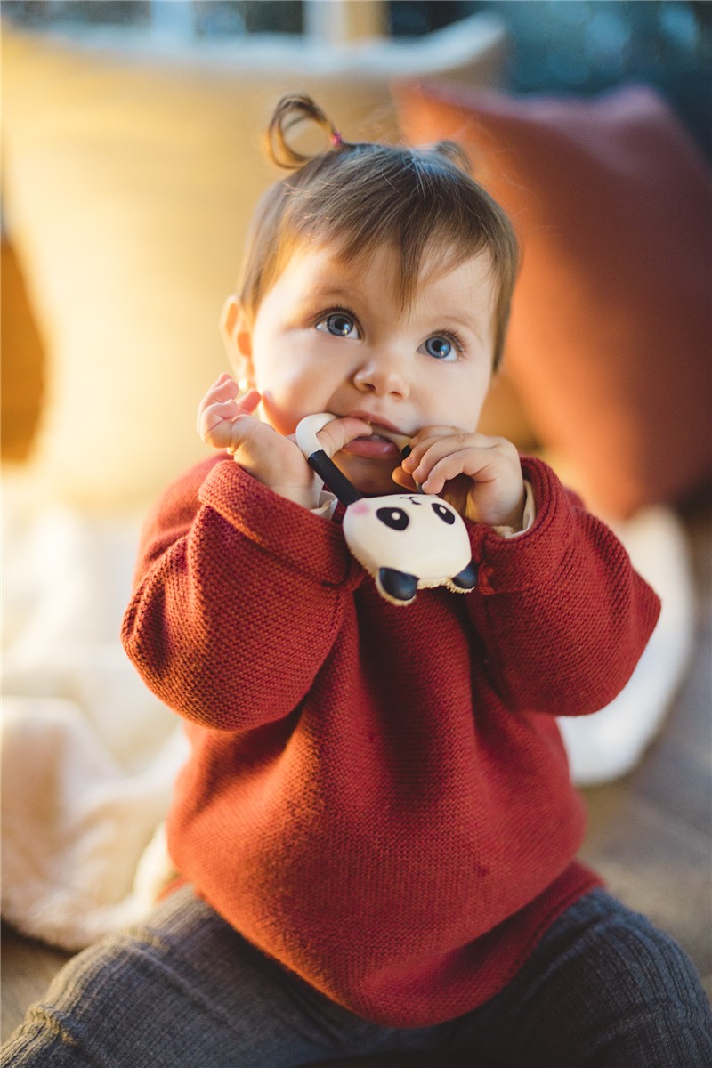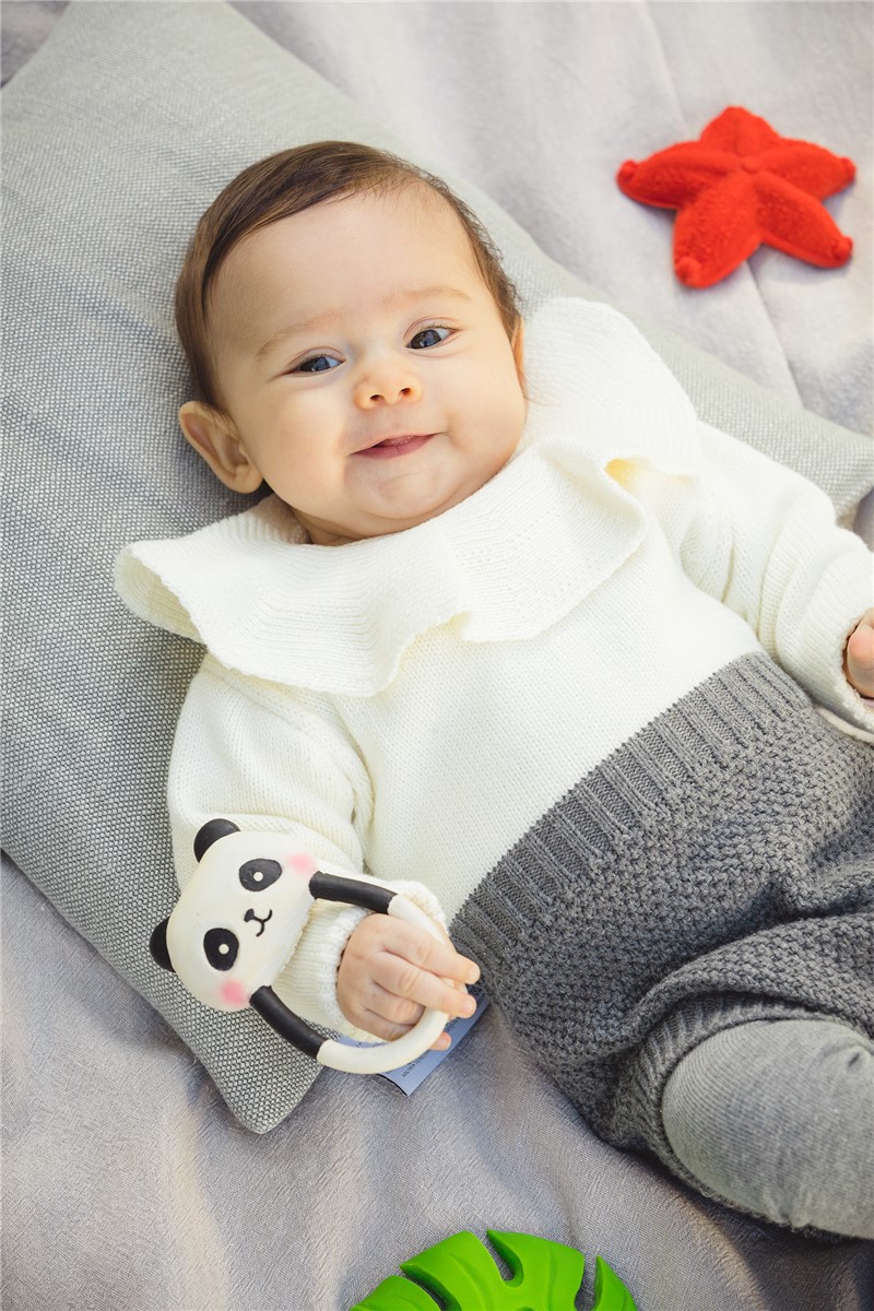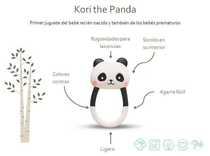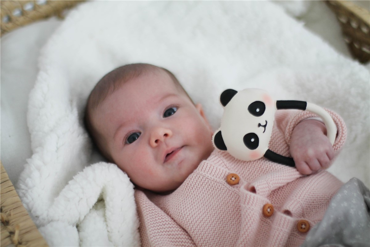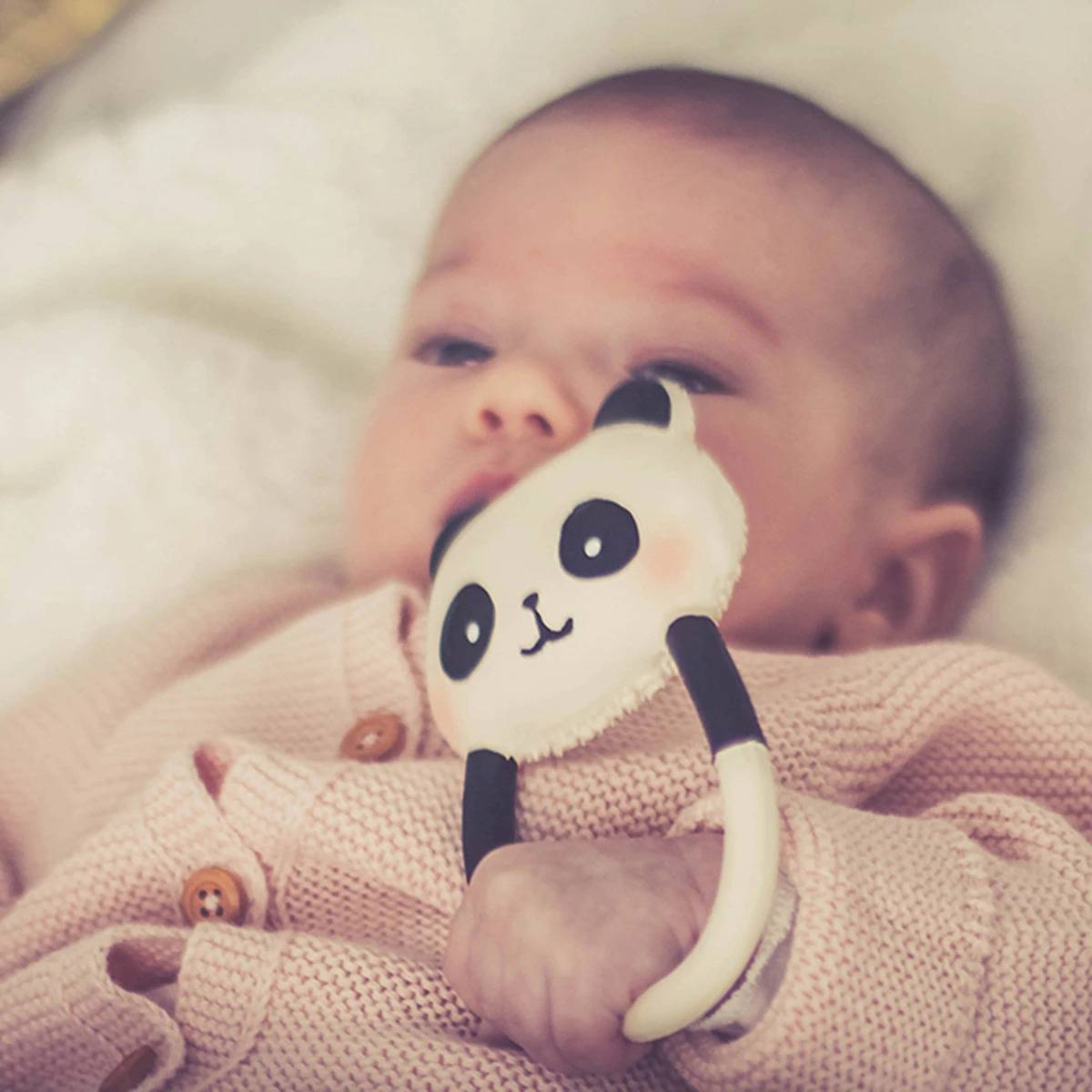 Mordedor sonajero con forma de panda de caucho natural para bebés, incluido prematuros. El primer juguete para tu bebé, hecho a mano y ecológico .