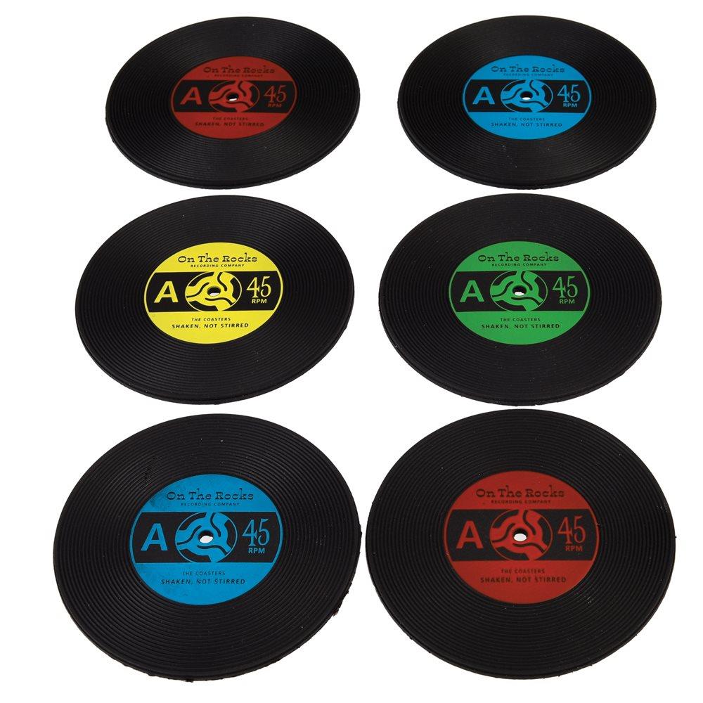 Juego de seis posavasos de silicona con forma de disco de vinilo.