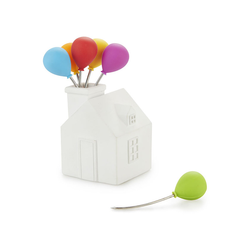 Set de palillos para aperitivo con forma de casita y globos saliendo de la chimenea.