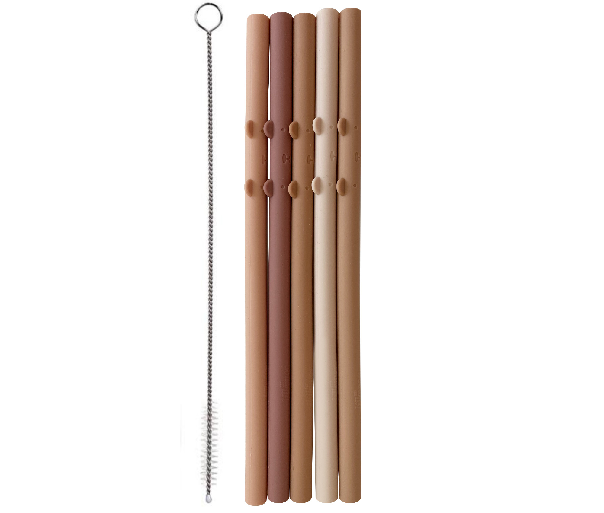Pack de cinco pajitas de silicona con cepillo de limpieza de acero incluido.